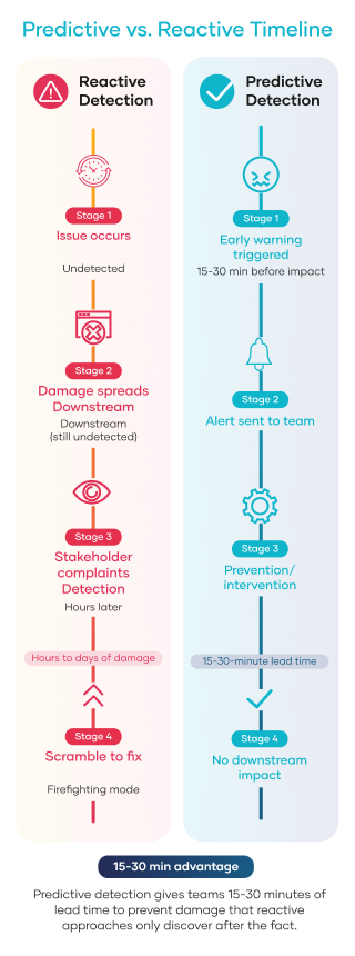 When data deviates from learned patterns, alerts fire before downstream impact, providing 15-30 minutes lead time for intervention.